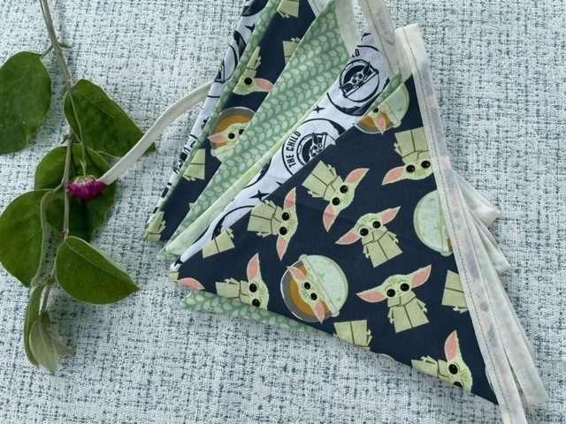 - the flags are a mix of co-ordinating greens with baby yoda designs and are fully reversible